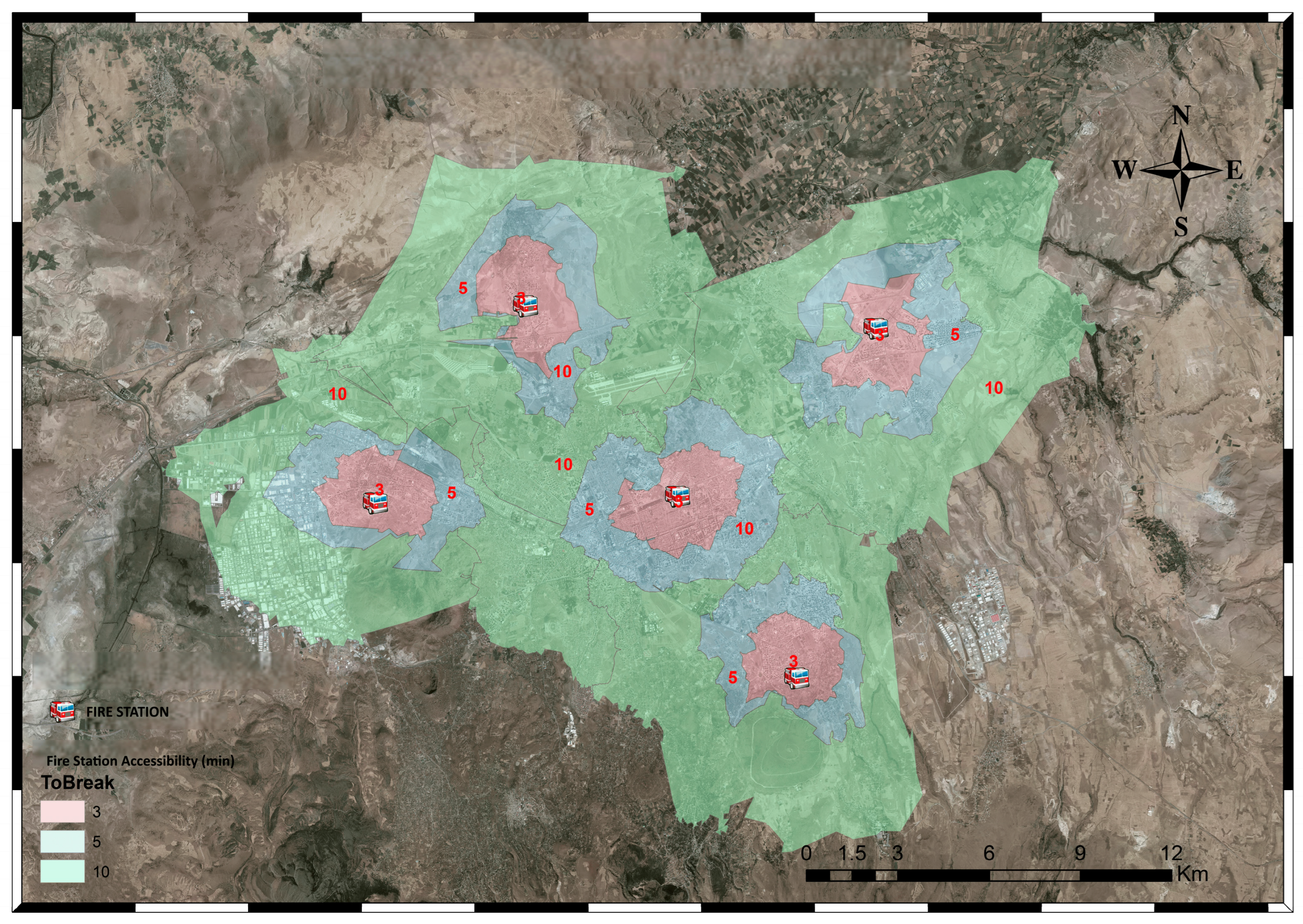 The analytical framework draws on three complementary geospatial datasets—historical fire incident reports, a topologically corrected digital road network, and the coordinates of active fire stations—all integrated within a GIS environment for the Kayseri metropolitan area (