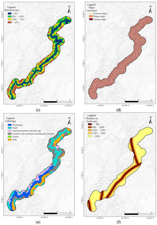 Aspect was subdivided into nine categories at 45° intervals: flat (0°), north (0–45°), northeast (45–90°), east (90–135°), southeast (135–180°), south (180–225°), southwest (225–270°), west (270–315°), and northwest (315–360°) (Figure 3b). Statistical data on landslides indicate that the vast majority of landslides around the Xiluodu Reservoir occur at elevations below 1000 m. Based on the topographical characteristics of the study area and the DEM elevation data, elevation was divided into four classes: <937 m, 938–1394 m, 1395–1871 m, and >1871 m (Figure 3c). Using a 30 m resolution DEM and GIS surface analysis tools, the slope curvature within the study area was found to range from −7.69 to 8.34. According to the classification criteria, slope curvature was divided into three categories: concave slopes (−7.69 to −0.05), linear slopes (−0.05 to 0.05), and convex slopes (0.05 to 8.34) (Figure 3d). Landslides were most likely to occur on slopes with gradients of 30–40° (Figure 3d).