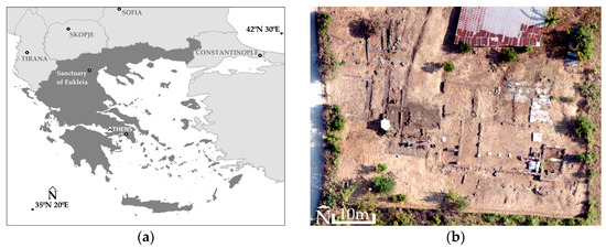 (a) The location of the archaeological site of the Sanctuary of Eukleia in Greece; (b) The archaeological site of the Sanctuary of Eukleia (excerpt from the orthophotomosaic generated by the RGB images; center of image 40°28′47.56″ N 22°19′16.82″ E).