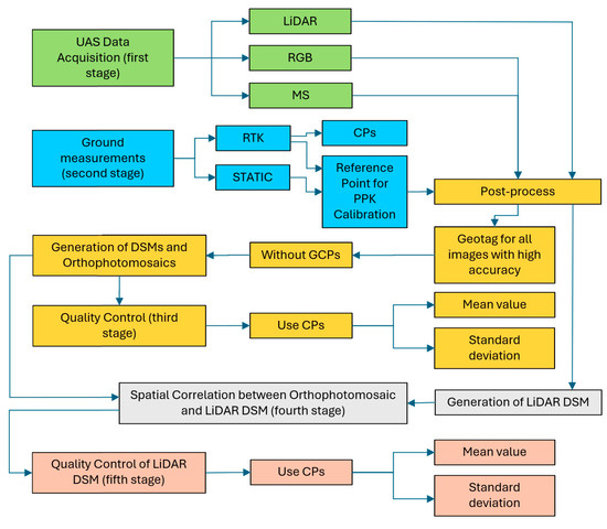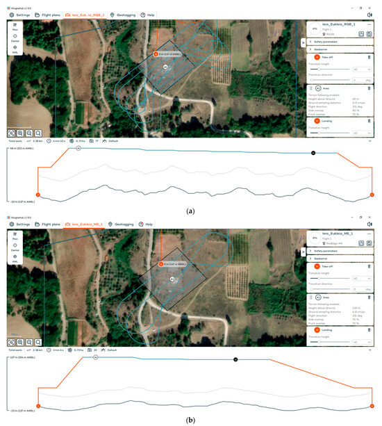 Prior to each flight (RGB, MS, and LiDAR), a randomly selected reference point was established near the UAS home position. Its X, Y, and Z coordinates in GGRS87 (Greek Grid, EPSG:2100) were first determined via RTK with ±1.5 cm horizontal and ±2 cm vertical spatial accuracy. At the same point the receiver then recorded static GNSS observations at that location for 30 min before takeoff, continuously during flight, and for 30 min after landing. By combining the high-precision reference coordinates, static measurements, and in-flight data from the UAS’s integrated multi-frequency PPK GNSS antenna, the projection center positions (X, Y, Z) for each RGB and MS frame were refined during post-processing in WingtraHub© v2.18.1 (Wingtra AG, Zurich, Switzerland), yielding accuracy of 2 cm horizontally and 3 cm vertically (GGRS87/Greek Grid, EPSG:2100).