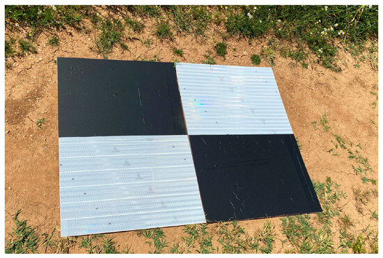 Upon acquiring the Hesai XT32M2X LiDAR (Hesai Technology, Shanghai, China) mounted on the WingtraOne GEN II (Wingtra AG, Zurich, Switzerland), an attempt was made to construct targets (Figure 4) identifiable by their reflectivity in the LiDAR point clouds. Each target has dimensions 70 × 80 cm and contains four internal square frames of 35 × 40 cm, two covered in matte black material and two in white reflective 3M™ Diamond Grade™ Conspicuity Markings Series 983–10 (3M, Saint Paul, MN, USA) [22]. The black panels were expected to absorb most of the laser energy, yielding minimal returns, whereas the white panels should have produced near total reflection and strong returns. Unfortunately, in two preliminary UAS-LiDAR test flights, the targets did not appear in the intensity data. For this reason, the planimetric accuracy assessment of the LiDAR-derived DSM was based not on target detections but on visual correlation with the RGB orthophotomosaic. Future experiments could address this issue by testing alternative reflective materials or by employing commercially available LiDAR-specific calibration targets designed to provide stable and uniform reflectance under varying incidence angles.