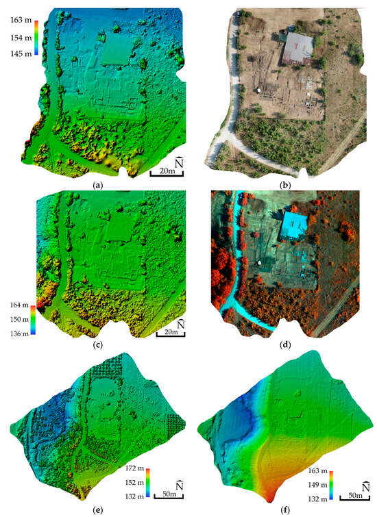 (a) DSM and (b) orthophotomosaic of the RGB images; (c) DSM and (d) orthophotomosaic (bands NIR-G-B) of the MS images; (e) DSM and (f) DTM from LiDAR; Center of images (a–d) 40°28′47.41″ N 22°19′17.13″ E; (e,f) 40°28′47.59″ N 22°19′16.14″ E.