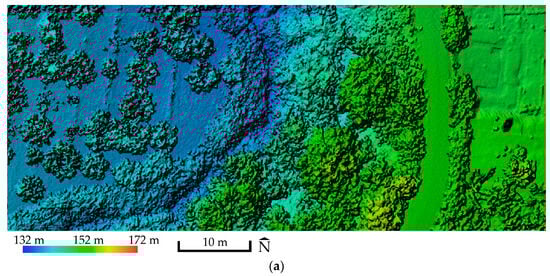 Given the exceptional planimetric precision of the RGB products, the RGB orthophotomosaic was chosen as the “reference base” for further comparative analyses. Specifically, examined whether the LiDAR DSM is spatially aligned with the RGB orthophotomosaic (Figure 9).