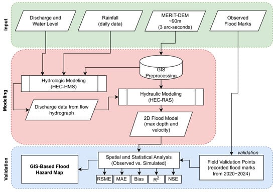 This diagram summarizes a GIS-first, three-phase workflow: input and GIS preprocessing, hydrologic–hydraulic modeling, and validation and integration, resulting in GIS-based flood-hazard maps.