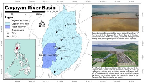 The CRB is the largest in the Philippines, approximately 27,300 km2 across northern Luzon and debouching into the Babuyan Channel. The Magat River Basin is a significant tributary contributing up to 35% of the downstream flow, regulated by the multipurpose Magat Dam. Key hydrological indicators, such as the Buntun Bridge in Tuguegarao City, are critical for monitoring flood severity across the basin.