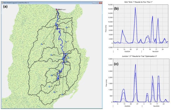 HEC-HMS simulation setup and hydrograph results for the Cagayan River Basin. The basin model in panel (a) shows the delineated sub-basins, junctions, and the main sink outlet used in the simulation. Panels (b,c) present the resulting daily hydrographs at Sink-1 and Junction J7, respectively. In both plots, the solid line represents the simulated discharge, while the dashed line represents the optimized (calibrated) discharge, highlighting the model’s ability to capture the timing and magnitude of multiple flood peaks.