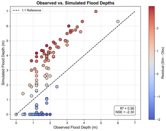 Scatter plot of observed versus simulated flood depths showing moderate correlation (R2 = 0.56) but poor predictive efficiency (NSE = −2.30), with red points indicating overestimation dominant in floodplains and blue points indicating underestimation in tributary areas relative to the 1:1 reference line.