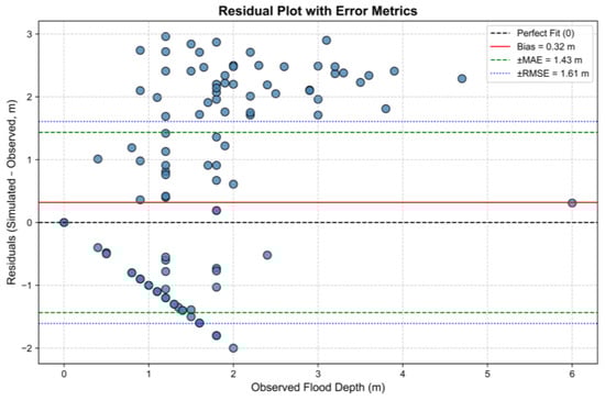 The residual distribution highlights the model’s limitations in capturing localized shallow flooding, while performing more reliably in deeper floodplain sections. The relatively moderate Bias, combined with high MAE and RMSE, confirms that, although general trends are captured, point-scale accuracy is variable. These findings align with the scatter plot interpretation and emphasize that while the HEC-HMS–RAS model is helpful for basin-wide hazard mapping, caution is warranted when interpreting localized flood depths at fine scales.