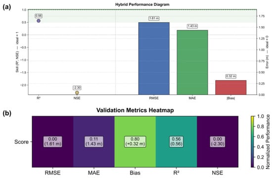 The summary of validation metrics is presented in Figure 9. The hybrid performance diagram (Figure 10a) illustrates both skill-based measures (R2 and NSE, plotted as dots) and error-based measures (RMSE, MAE, and Bias, shown as bars). The results show that while the model achieved a moderate correlation with observed flood marks (R2 = 0.56), the predictive efficiency was low (NSE = −2.30). Error magnitudes remained notable, with RMSE = 1.61 m and MAE = 1.43 m, indicating average depth discrepancies of approximately 1–2 m. The bias was relatively small (+0.32 m), suggesting a slight overall overestimation tendency; however, localized underestimations were also evident in tributary areas.