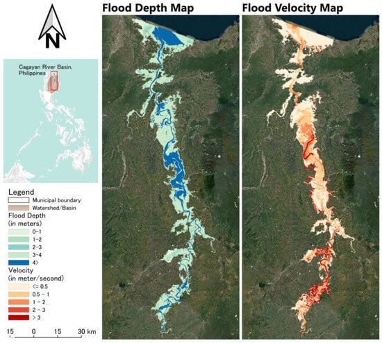 Flood depth and flood velocity maps generated from the hydrodynamic simulation of the CRB. The maps show the spatial distribution of inundation depths and flow velocities, highlighting the concentration of deeper and faster flows along the main river corridor.