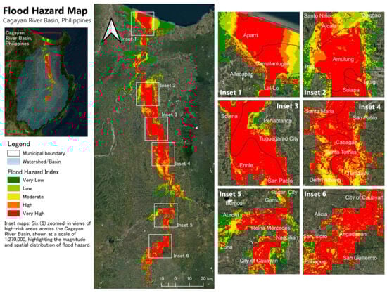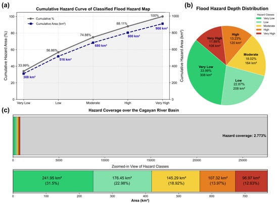 Floods are among the most devastating natural hazards, causing widespread damage to lives, livelihoods, and infrastructure, particularly in vulnerable river basins. The Cagayan River Basin (CRB), the largest and most flood-prone basin in the Philippines, remains a significant challenge for disaster risk management. This study developed an event-based hydrologic–hydraulic modeling framework by coupling HEC-HMS rainfall–runoff simulations with HEC-RAS 2D unsteady flow routing to produce validated flood hazard maps. Inputs included rainfall from 41 gauge stations and observed inflows from the Magat Dam, processed in HEC-DSS. Validation utilized 137 surveyed flood marks collected from post-flood surveys, community reports, government archives, and household RTK measurements, with a concentration in Tuguegarao City. The coupled model reproduced key hydrograph peaks with moderate accuracy (R2 = 0.56, Bias = +0.32 m, RMSE = 1.61 m, MAE = 1.43 m), although NSE (−2.30) reflected the limits of daily rainfall inputs. Simulated hazard maps identified 767.97 km2 of inundated area (approximately 2.77% of CRB), concentrated along the floodplain and at the Magat confluence. Unlike previous scenario-based or localized efforts, this study delivers the first basin-wide, event-validated flood hazard maps for the CRB using integrated depth and depth–velocity criteria. The resulting hazard layers provide a scientific basis for strengthening evacuation planning, guiding land-use and infrastructure decisions, and supporting long-term resilience strategies in one of the Philippines’ most flood-prone rivers.