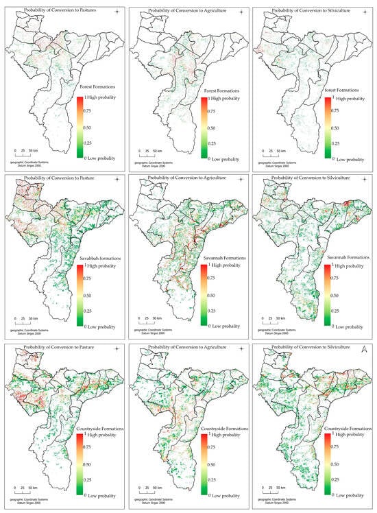 As for isometry, a value of 1.5 was adopted for both the patcher and expander functions, resulting in more isometric (compact) rather than linear fragments. Isometry is a parameter that regulates the influence of spatial distance on transition probabilities and is associated with the fractal or geometric dimension of the neighborhood space. Its value ranges from 1 to 2. In “Dinâmica EGO”, isometry defines how the spatial neighborhood influences land use dynamics, controlling the intensity of spatial effects on the transition process. The default value is 1.5, which enables calibration for different spatial patterns, such as more diffuse or more clustered transitions. In this study, the model was set to the default value of 1.5, as predefined by the “Dinâmica EGO” developers in the open-source configuration. The size of the new fragments was calculated based on the mapped area. Thus, their average size and variance were defined as 1 and 10 hectares, respectively, equivalent to 12 and 120 cells. These values were established by verifying the average sizes of transition areas. As a result, nine transition probability maps were generated for cells transitioning to pasture, agriculture, and silviculture, in which areas with a higher tendency toward spatial change can be identified [,,].