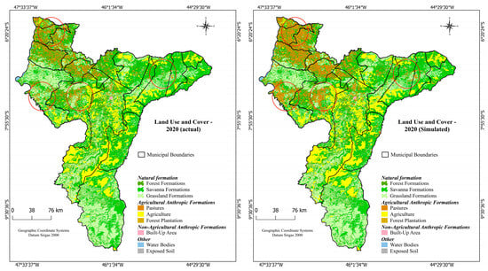 Comparison between the actual and simulated maps for the Southern Maranhão Mesoregion, Brazil. Red circles highlight the areas that showed the greatest differences when comparing actual and simulated data. Source: the authors.
