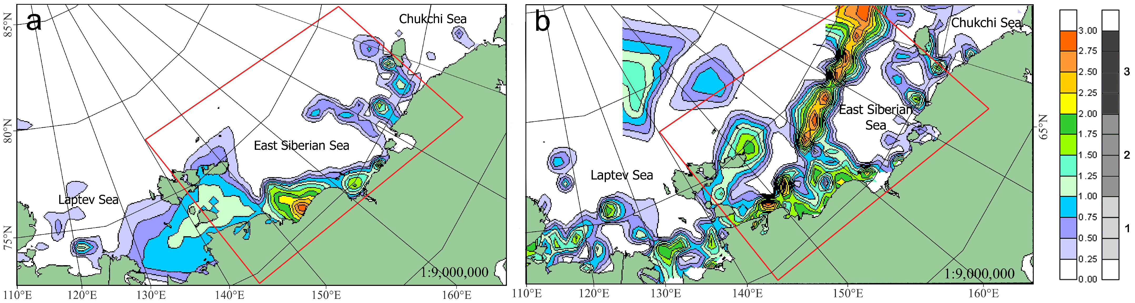 41] for the Arctic Ocean at spatial resolution of 24’ × 6’ and for the East Siberian Sea in a nested grid at a spatial resolution of 9’ × 3’.