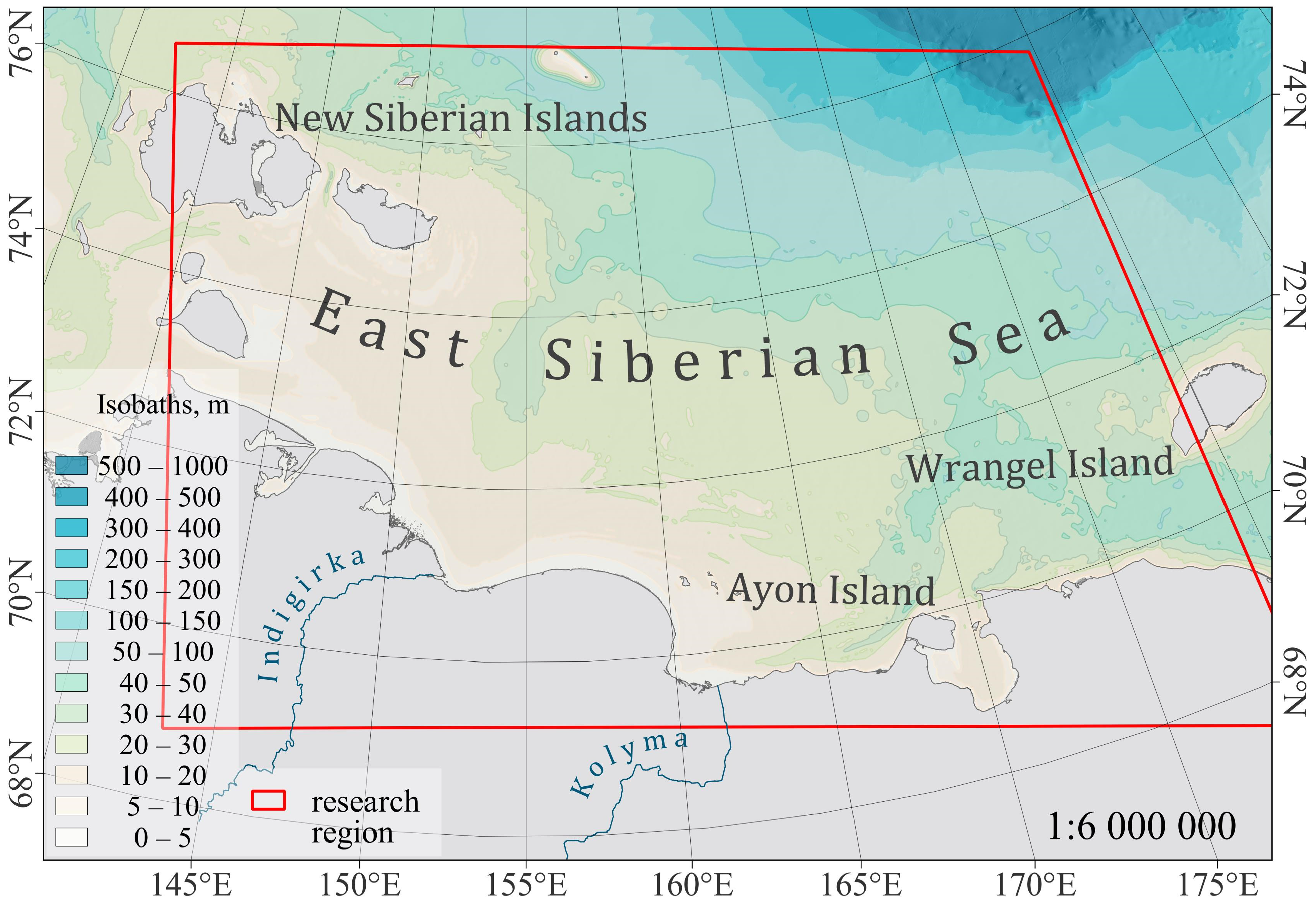 To investigate shallow areas in the East Siberian Sea, which are the main areas of dirty ice formation, we used the latest version 5.0 of the IBCAO data. Data with a resolution of 400 m were acquired from
