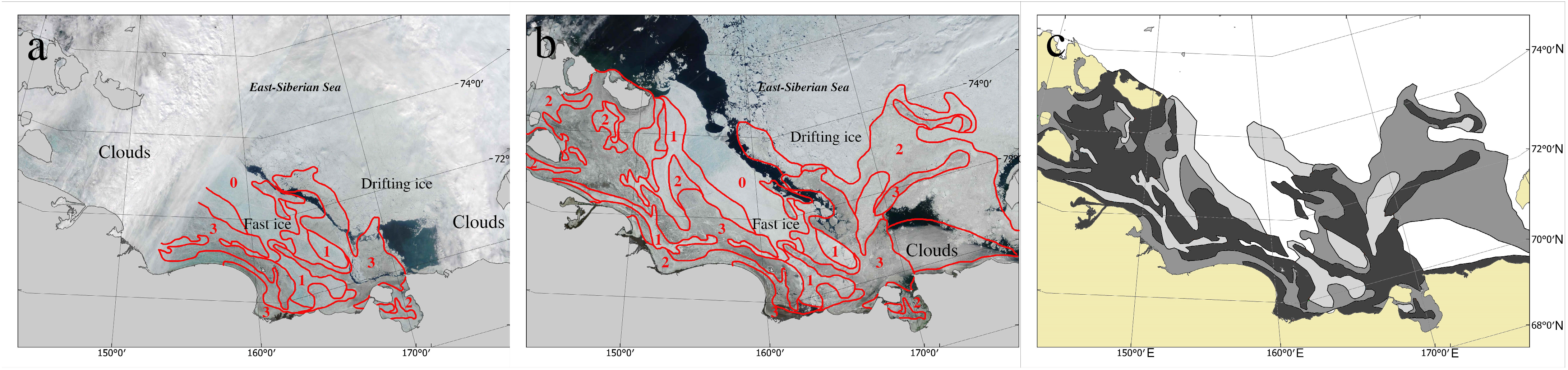 Figure 2). The maps are drawn manually by the same methodology that was used for compiling maps during ice aerial reconnaissance. The slight difference in the mapping process is due to differences between the satellite image in the visible range and the real ice cover observed during the reconnaissance. This mapping approach includes the visual interpretation of images for the period from snow melt on ice surface until the landfast ice decay, which resulted in one map of dirty ice for each year. The map presents the degree of ice dirtiness based on a four-class classification. This approach shows the dirtiness of the ice upper layer, i.e., sediment particles entrained at the very beginning of new ice formation.