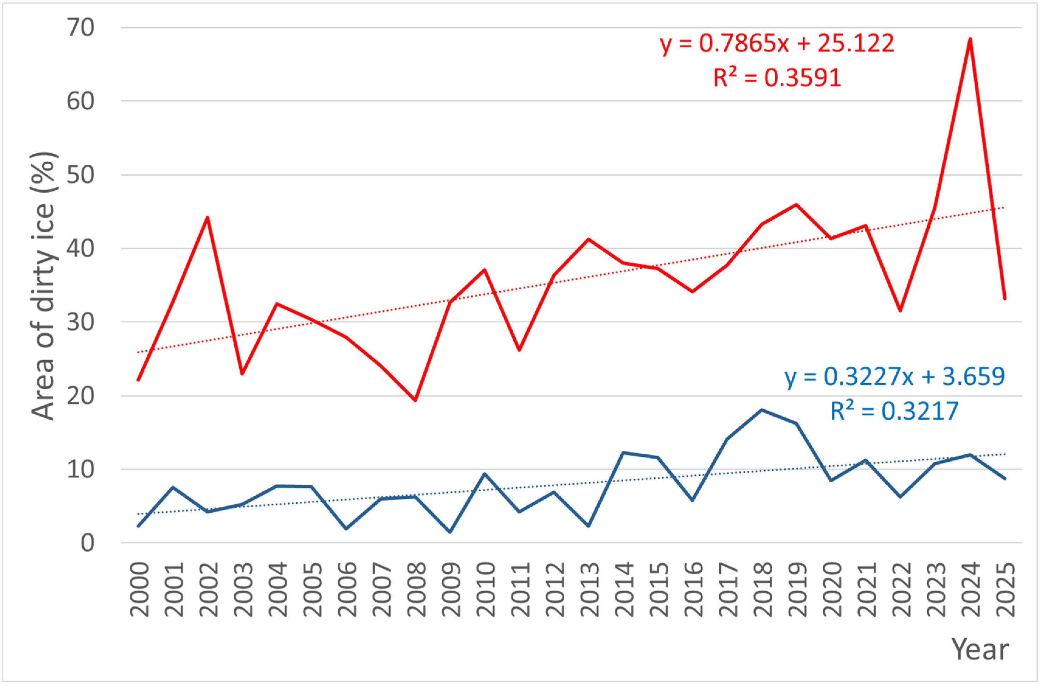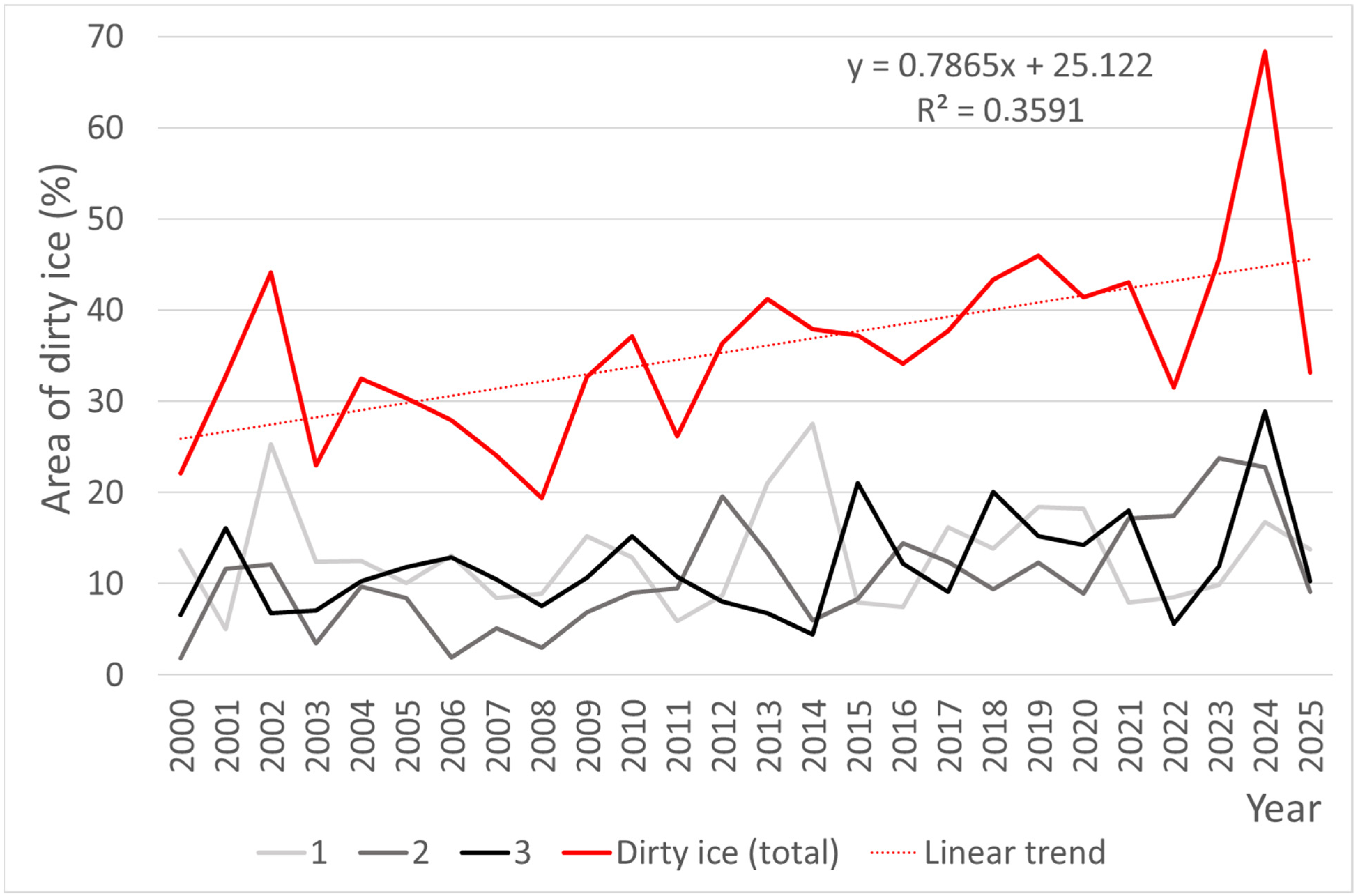 The analysis of the area of dirty ice in the East Siberian Sea over the period 2000–2025 also reveals an increase in dirty ice area, both locally sourced and exported from the Chukchi Sea.