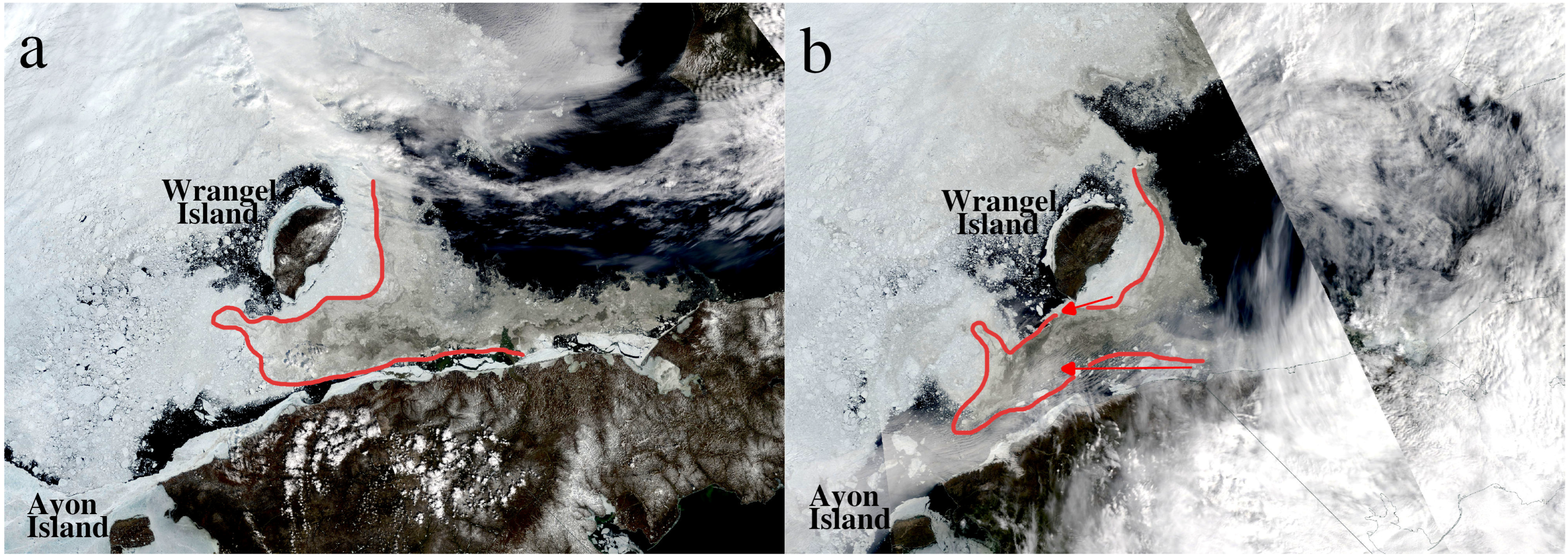 Figure 12 shows that the amount of dirty ice in the eastern part of the East Siberian Sea tended to increase throughout the study period. An analysis of the configuration of dirty ice zones from the maps (