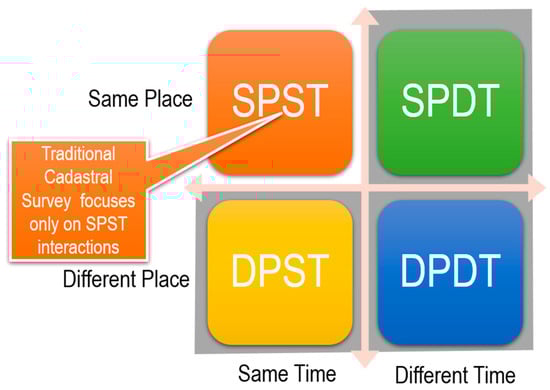 Cadastral surveys are not exclusively restricted to a same-time, same-place setting. For the cases of first-time land registration, solving unmapped certificates, and executing boundary resurveys, group interactions using the same-time, different-place and different-time different-place schemes could be used. For example, in order to expand opportunities for landowners to participate, a digital dashboard enables invited guests to tag their parcel location on the parcel map and to provide notations related to their land’s legal certainty. Such a possibility can be used to replace offline invitations at a given time slot in the village office, which has been proven to be attended by less than 40% of invited names (as implemented in several cities during the quality-improvement project) due to time and distance constraints [13]. Figure 1 draws four quadrants of collaboration mechanics in cadastral surveys and highlights the common tendency in traditional cadastral survey practices. Here, the term collaboration mechanics, which covers coordination and communication in groupware [16], can be adopted for evaluating use of geospatial groupware tools like participatory mapping maps [17]. Table 1 exemplifies use cases where AR/VR can be utilized to realize groupware extensions in the cadastral surveys.