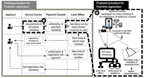 First-titling registration scenario using Geoclarity: the existing vs. proposed procedure (black dashed box).