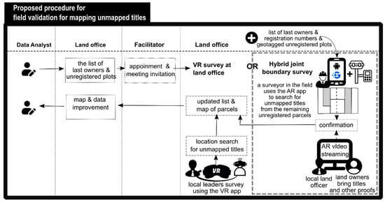 - Quality improvement of cadastral data—testing if and how AR/VR can improve title search and discovery by community leaders and neighbors based on the last landowners’ names and neighboring parcels, typically performed in a meeting facilitated by land officers and surveyors to plot the remaining unmapped titles in a village or urban ward (see [15]).