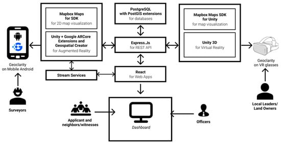 In order to develop a validation test environment, named Geoclarity—Geocollaboration Tools for Land Registration Survey with Augmented and Virtual Reality—three applications are developed: (1) an AR app that superimposes an AR camera with 2D parcel boundaries on 3D building outlines and attributes; (2) a VR app that presents a 3D city model which contains 2D cadastral boundaries and attributes; and (3) a mediation dashboard, integrating field surveys and coordination meetings in a live stream. The mediation dashboard is intended to mediate boundary delimitation and to allow for the confirmation of relevant parties, landowners, officers in the land office, and surveyors, in the field in real time using livestream coordination. All these three are primary tools to validate the appropriateness of the three new proposed workflows defined in Section 2.3. AR and VR are developed using game engine software, i.e., Unity. Unity has been identified as one of the potential geovisualization platforms, given the nature of interactivity and partial support for geospatial data [41].