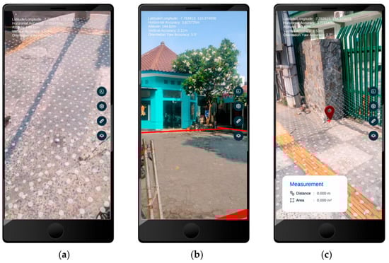 The display of AR mode: (a) AR app can switch to AR mode, (b) parcel boundaries can be seen superimposed over the physical property objects, (c) distance measurements can be performed by targeting points on the targeted objects.