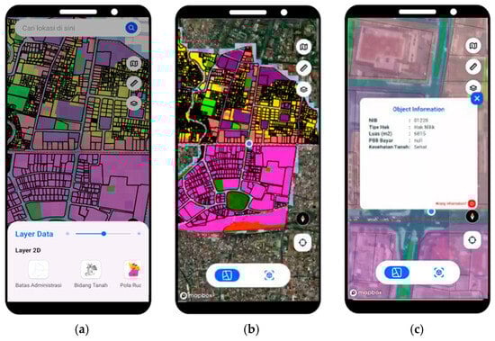 The display of 2D map view: (a) Land parcel boundaries can be displayed as 2D layers on the AR app, (b) land parcel boundary layers can be displayed with orthophoto, and (c) parcel information can be previewed by interactively clicking on the targeted land parcel.