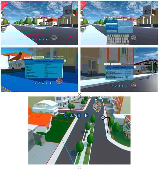 Figure 8 illustrates the display of buildings with level of detail three (LOD3) and the corresponding complete attribute. The LOD3 building models were manually generated from LiDAR and orthophoto data acquired using high-definition UAV LiDAR sensors. The detailed technical procedures for the building modeling process are described in our previous study [44], which supports this research. The resulting models were then visualized in a VR environment to enable an interactive land surveying process. VR also has the ability to allow users to measure land parcel measurement outcomes and to explore building attributes related to their ownership, use, tax, and permit statuses. When a land parcel is clicked, it can display information to clarify details for the user or landowner. Figure 8 shows the development of the VR app. The app has the ability to allow users to perform a parcel search by its identifier. In addition to those functionalities, the VR app can also help users to display attributes and to look for the nearest places of interest, and to conduct measurements.