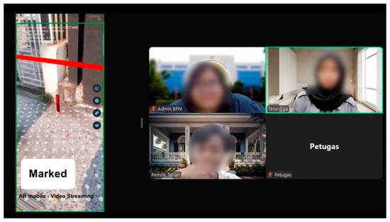 As seen in Figure 3, initially, a right-holder (as an applicant) requests changes to their land boundaries (i.e., subdivision). This application prompts BPN surveyors to conduct field surveys and collect updated geospatial data, given that the application documents are submitted and the payment is completed. Some required documents include the signed neighbors’ consent in regard to parcel boundaries and the proposed split line and modification of the parcel. In the existing procedure, the physical attendance of the landowner to join the survey is required. Otherwise, a landowner’s representative or someone on the landowner’s behalf must be at the location when the survey is conducted. The proposed procedure encourages applicants to include geotagged points of existing and proposed splitting point boundaries in their application form. Landowners and neighbors can join the surveyor’s work in dividing the parcel virtually using real-time video streaming. During the process, the proposed splitting lines are overlaid onto the AR camera and shared to landowners via video streaming. This process is assumed to increase the effectiveness with which surveyors can execute a division in the field because it allows them to (virtually) see the lines directly in the system instead of having to mark a virtual line in the field. Once the parcel’s modification is confirmed, the cadastral survey can be carried out with the GNSS (Global Navigation Satellite System) instrument. Further, the data are verified by the BPN land office, and the progress can be tracked until the new land certificate titles of the updated parcel are published and delivered.