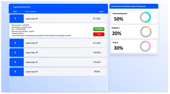 There are several processes in land administration services that need to be conducted on a different platform to ensure accessibility from anywhere without the use of specialized devices. This platform is a mediation dashboard, which can present an AR camera, a Video Conference Camera, and a 3D virtual environment (VR view) if necessary. Such video conference dashboards can be replaced using other familiar teleconference software (e.g., Zoom, Google Meet, or Microsoft Teams) (Figure 9). Another window is field report management, which enables the inspection and editing of field reports submitted through AR/VR forms. This field report management handles field submissions performed by surveyors, landowners, and notaries related to errata or missing information about their land parcel of interest (Figure 10).