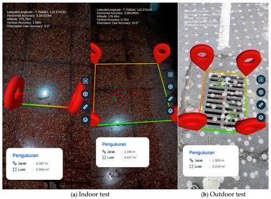 The tools on the right side of the screen enable surveyors to switch from AR camera to 2D map, manage settings, use a ruler to measure distances, and load thematic layers. The measurement box (‘Pengukuran’) shows the resulting distance (‘Jarak’) and area (‘Luas’). The position coordinates, absolute positioning accuracy, vertical accuracy based on global elevation, and orientation accuracy are also displayed in the top left corner of the screen: (a) Indoor measurement tests. (b) An outdoor measurement test, as performed in [46].