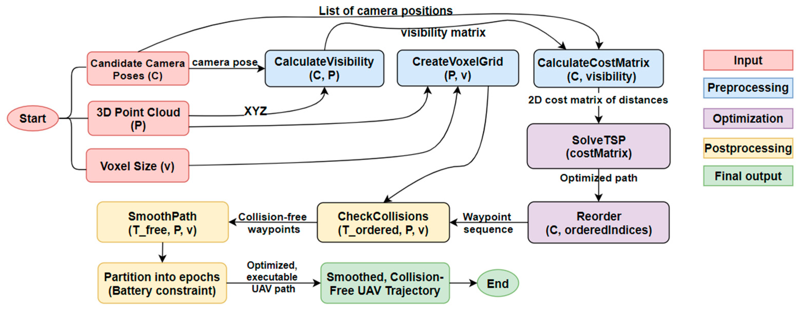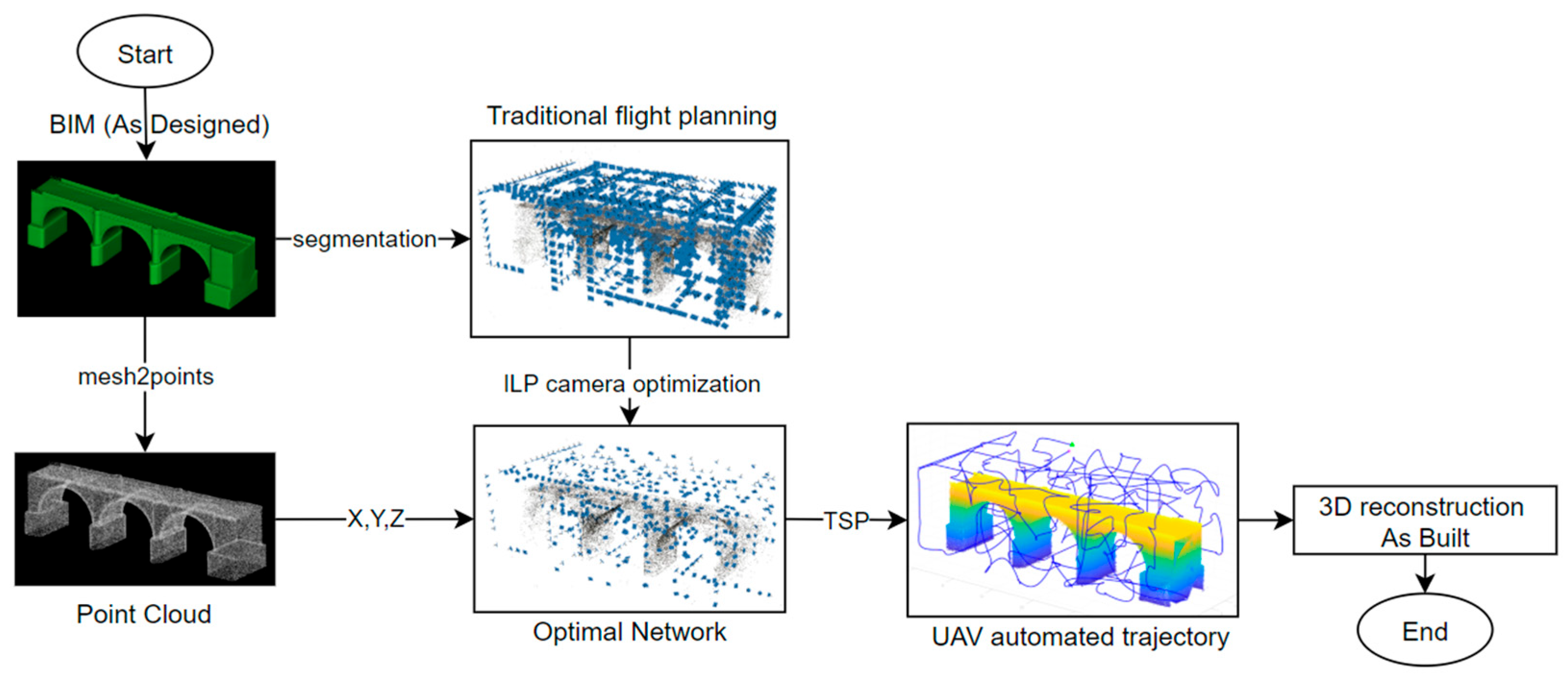 This section presents the complete pipeline for autonomous UAV trajectory planning, integrated with BIM-aware, ILP-based camera network optimization. The proposed approach comprises three interconnected steps: (1) BIM-based scene preparation and visibility simulation, (2) camera network optimization via ILP, and (3) trajectory generation based on a Traveling Salesman Problem formulation. A summary of the proposed approach, illustrating the entire process, is provided in