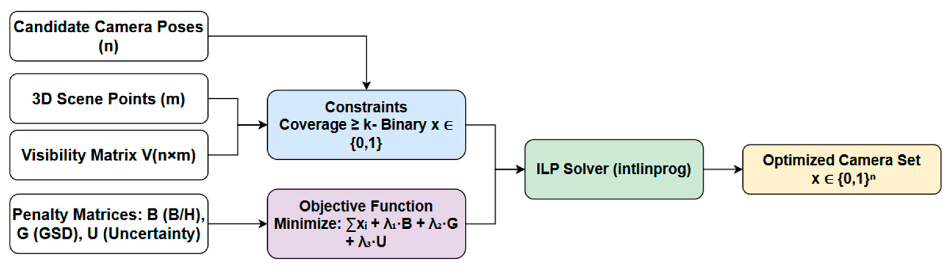 In summary, the ILP objective in Equation (3) combines sparsity with photogrammetric penalties under the coverage constraint in Equation (4) and binary selection in Equation (5), with decision variables defined in Equation (1) and visibility given by Equation (2).