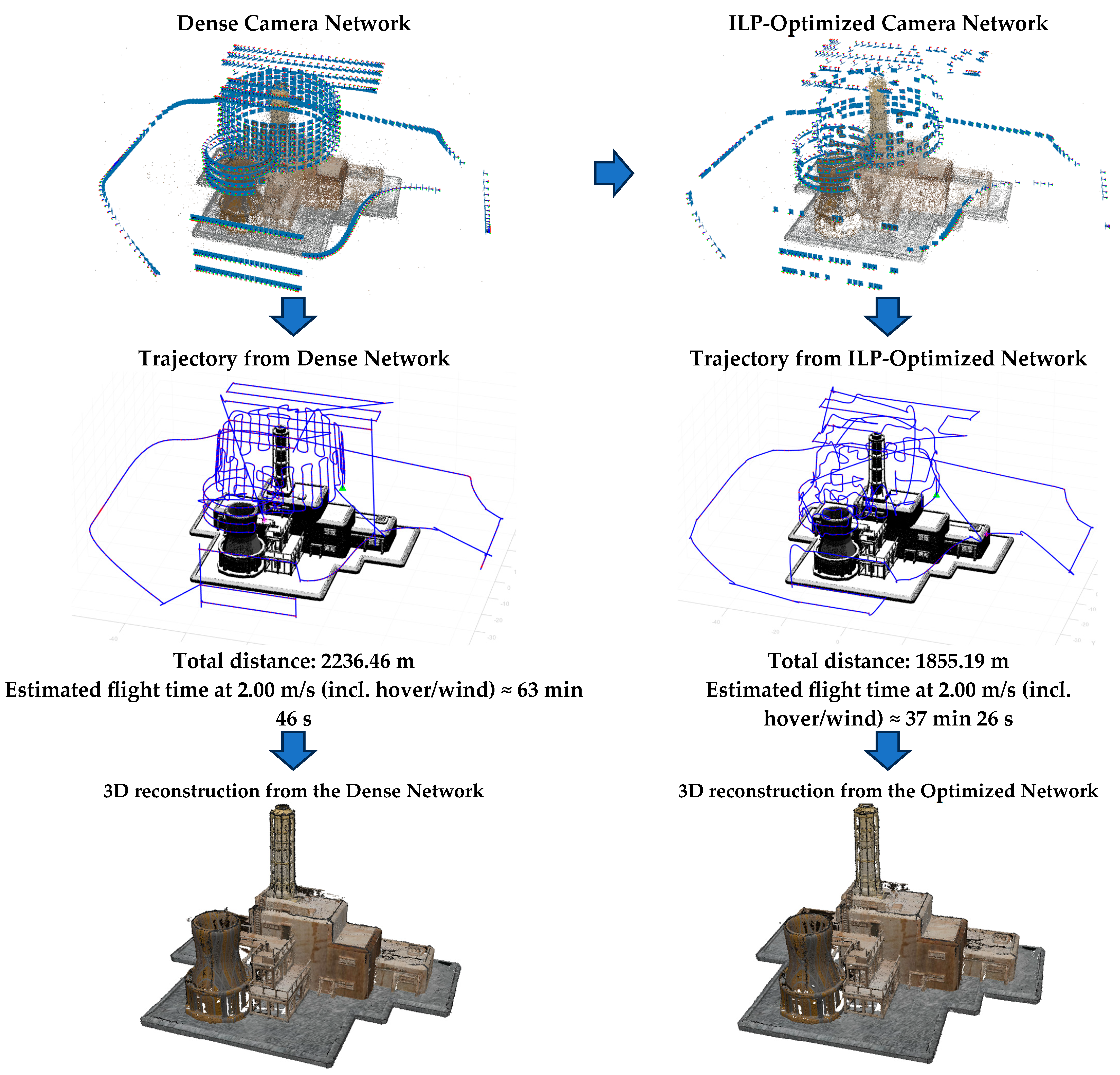 The initial dense network comprised 3025 candidate camera viewpoints, from which the ILP optimization retained 2078 cameras (≈31% reduction) while meeting the coverage requirement and photogrammetric quality constraints. The visual comparison of UAV trajectories and resulting reconstructions for the full dense network and the ILP-optimized network is shown in