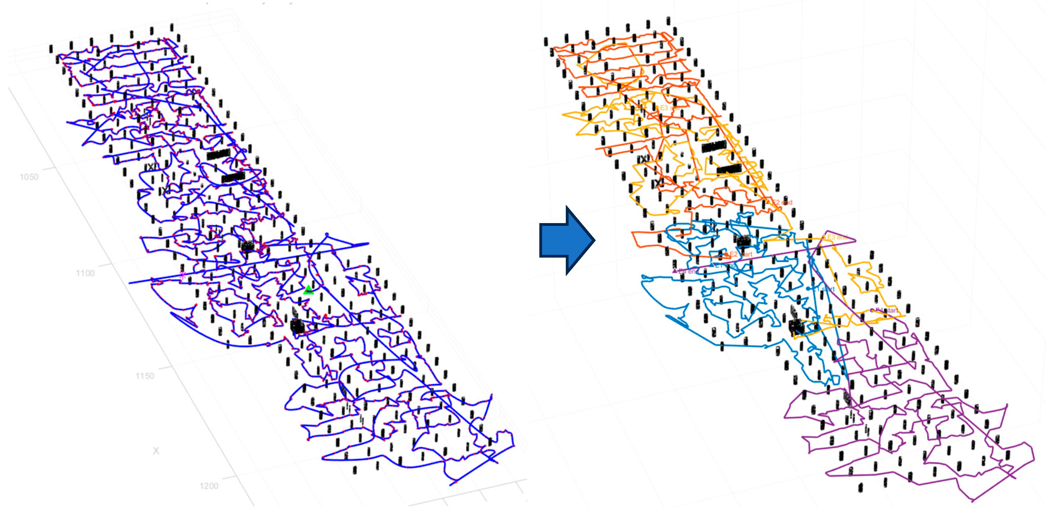 Figure 5 shows the UAV trajectory for the bridge case before and after battery life constraint partitioning.