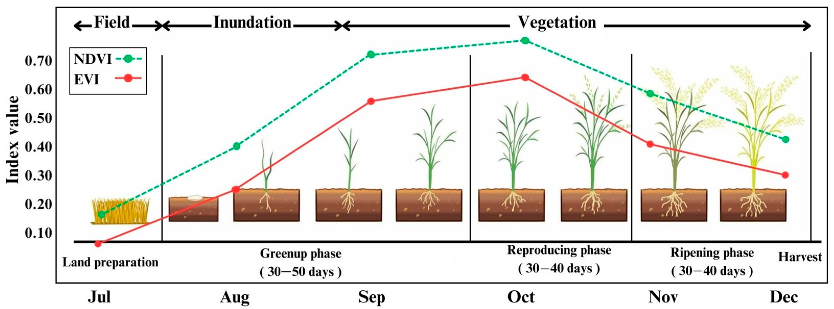 2.2. Rice Growth Phenology and the Role of Vegetation Indices NDVI and EVI