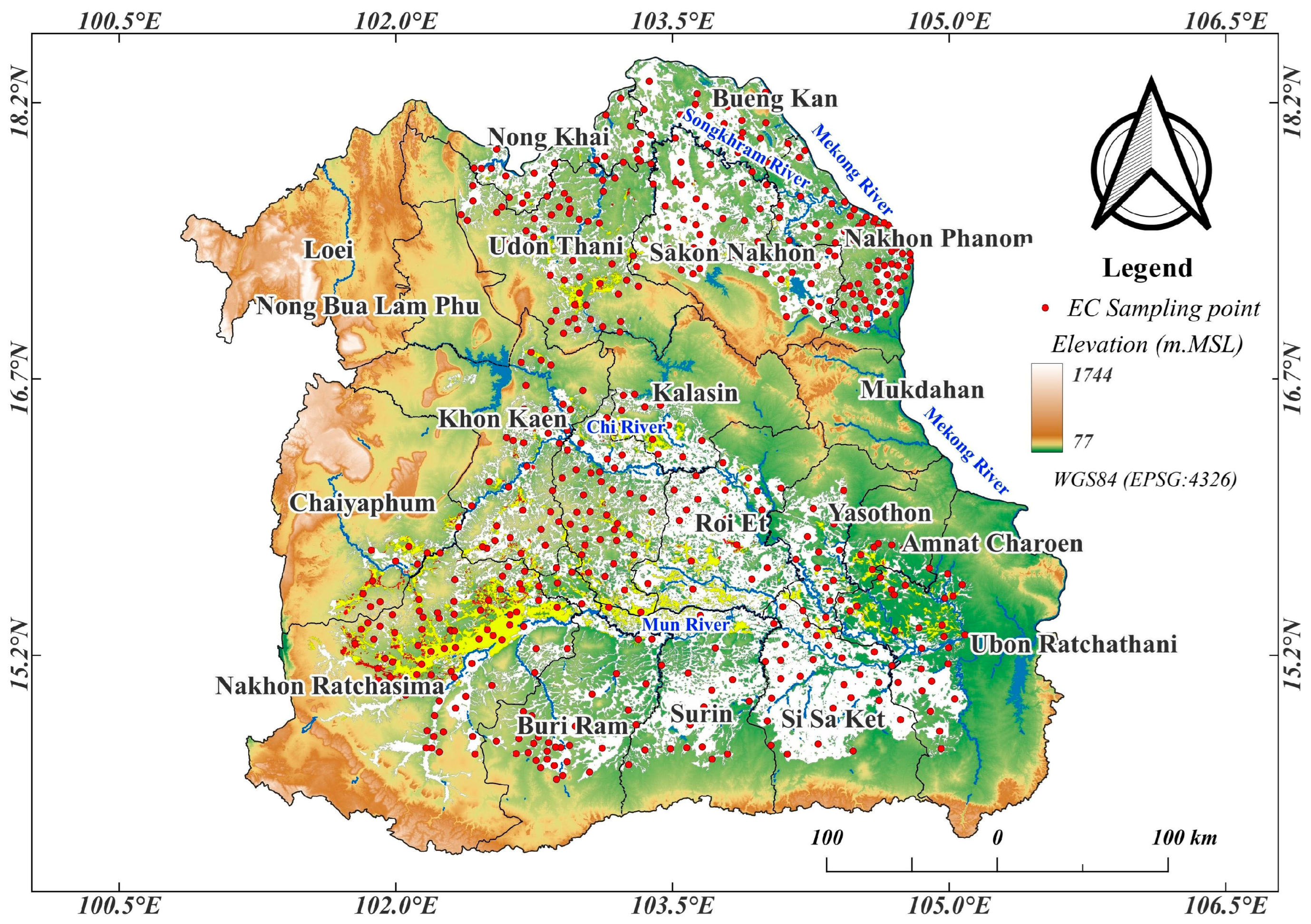 - Leksungnoen, N.; Andriyas, T.; Andriyas, S. ECe prediction from EC1: 5 in inland salt-affected soils collected from Khorat and Sakhon Nakhon basins, Thailand. Commun. Soil Sci. Plant Anal. 2018, 49, 2627–2637. [Google Scholar]