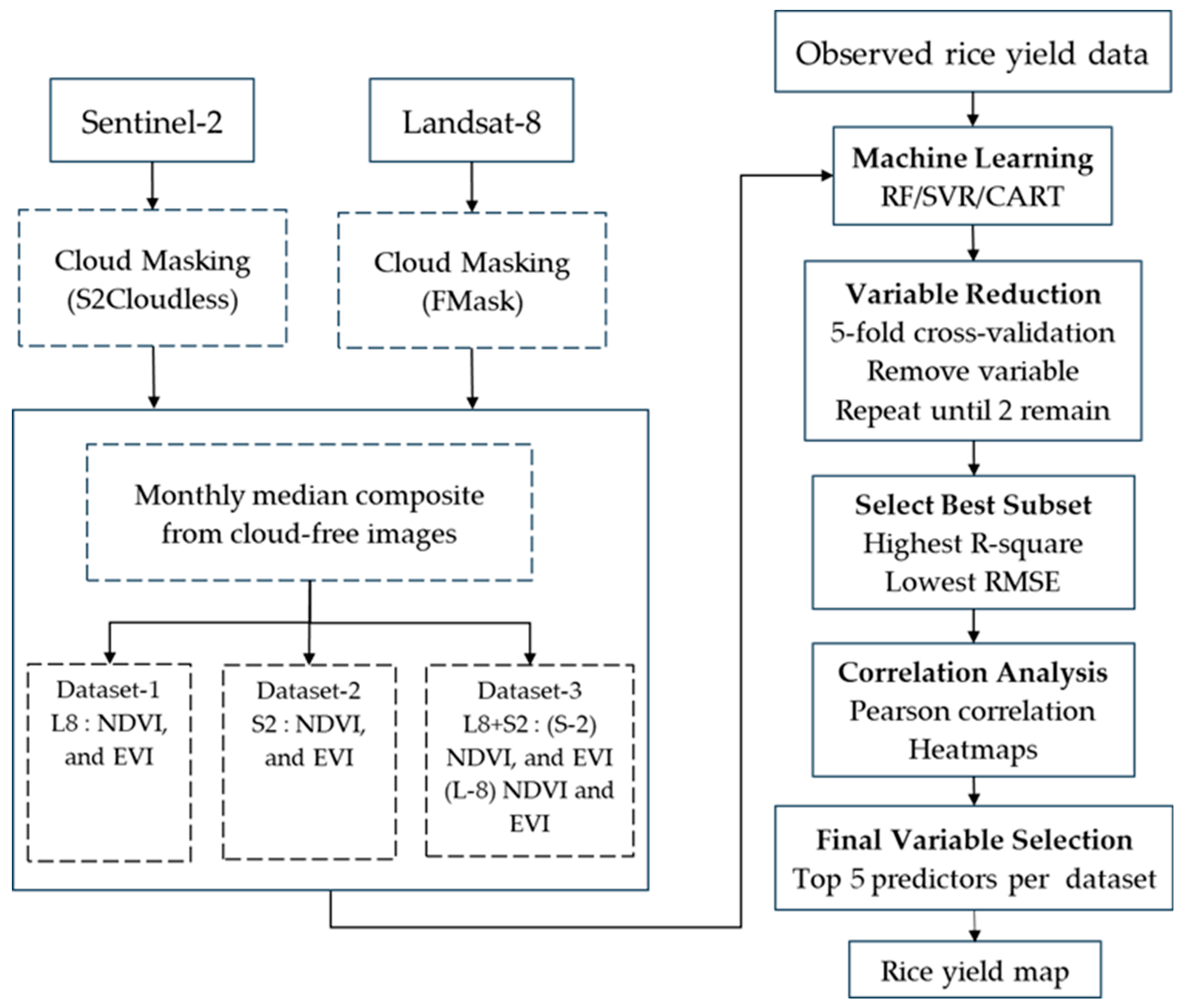 - evaluate the effectiveness of time-series Sentinel-2 and Landsat-8 data combined with vegetation indices (NDVI, EVI) and ML algorithms for rice yield prediction;