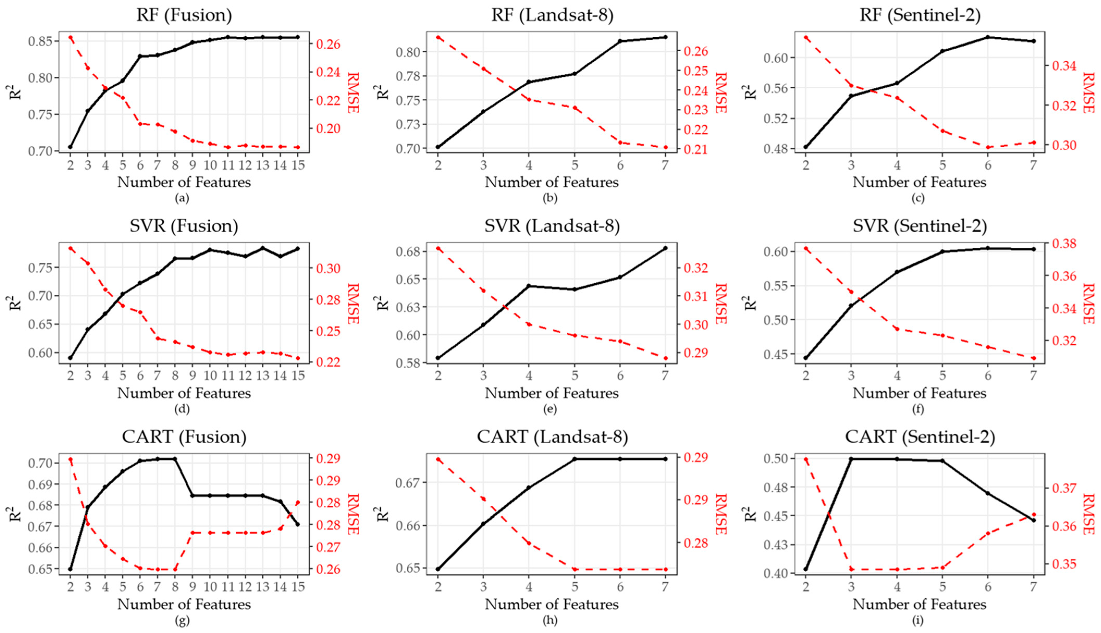 | Dataset | Random Forest (RF) | Classification and Regression Trees (CART) | Support Vector Regression (SVR) | |||||||||