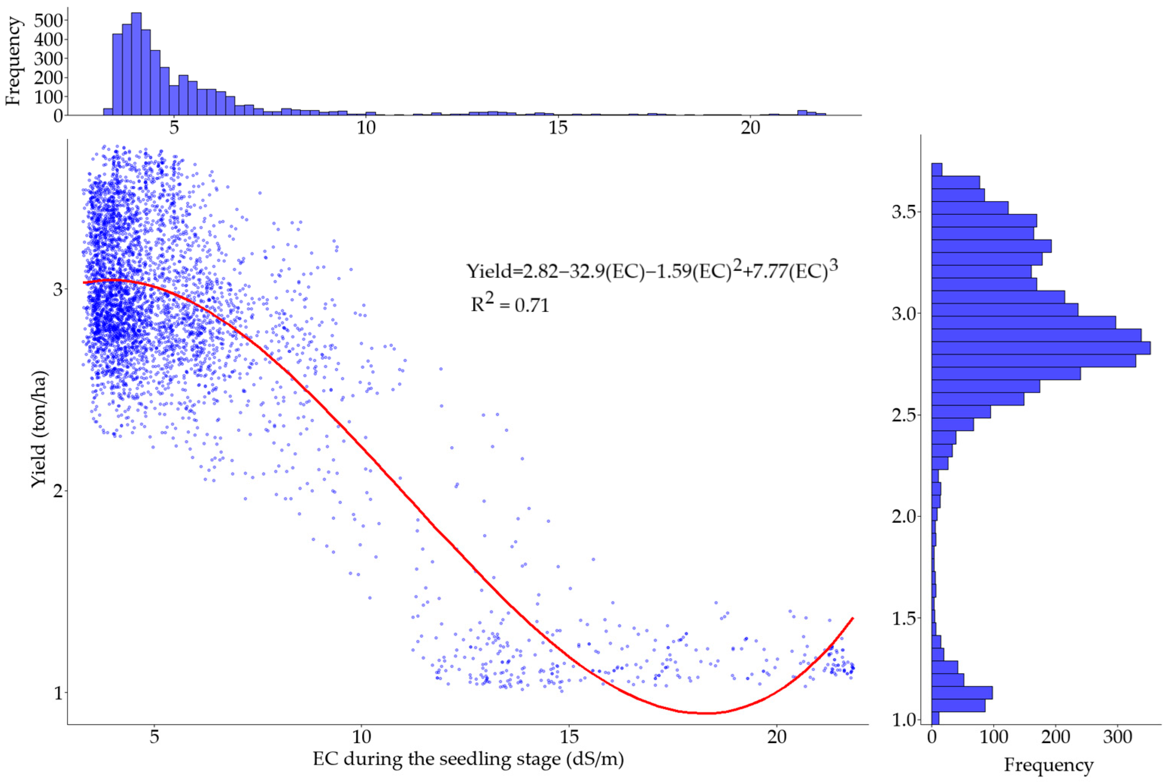 4.3. Relationship Between Soil Salinity and Rice Yield