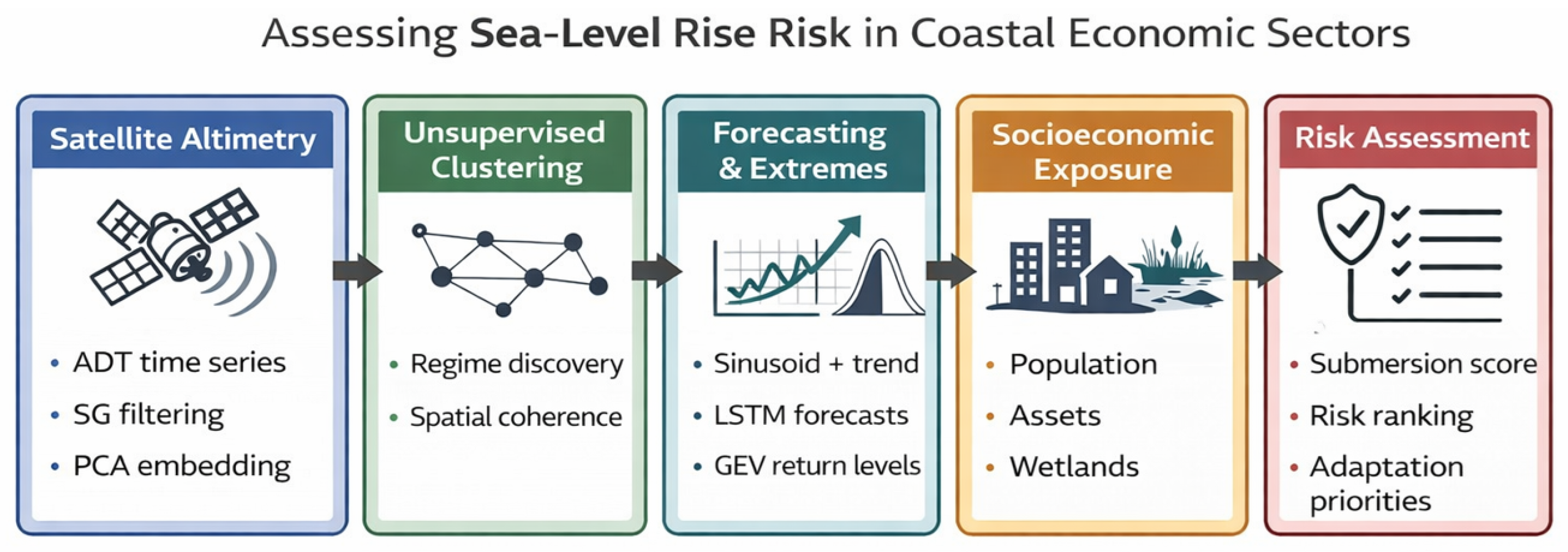 Collectively, these works provide a robust foundation for understanding both the physical mechanisms and socioeconomic consequences of SLR. However, most studies focus either on global projections or on localized impact assessments, leaving a methodological gap for regionally validated, data-driven frameworks that couple physical dynamics with socioeconomic exposure. Few efforts deliver an operational workflow that (i) learns dynamical regimes directly from gridded satellite altimetry, (ii) rigorously validates predictive gains against standard time-series baselines at basin scale, and (iii) fuses learned physical regimes with socioeconomic and ecological indicators to produce actionable, ranked coastal risk tiers.