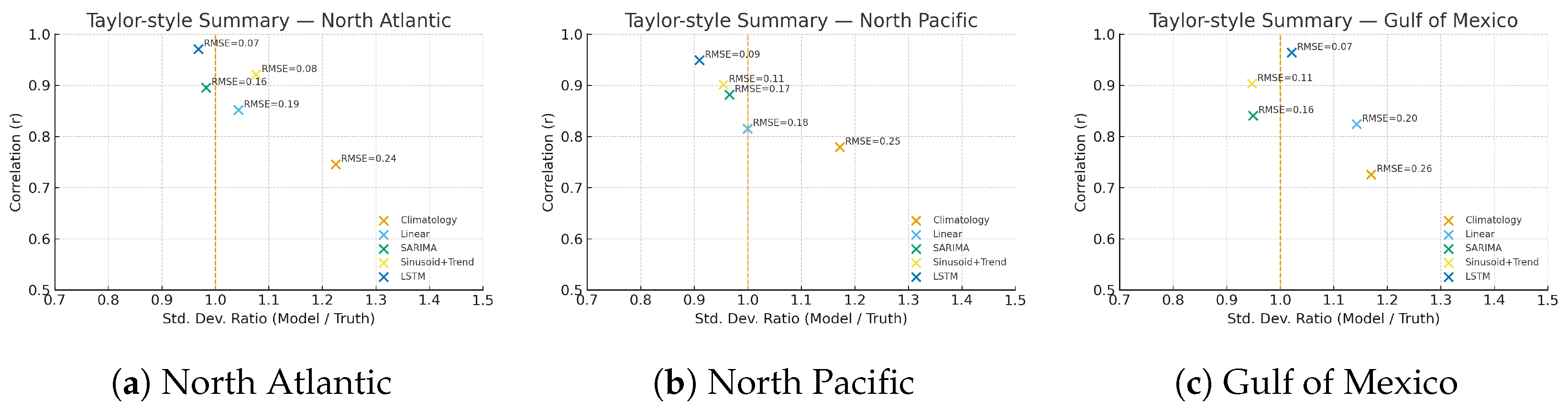 H2: (Model skill): The sinusoid+trend model and LSTM reduce test MAE relative to SARIMA by ≥15% across North Atlantic, North Pacific, and Gulf of Mexico basins.