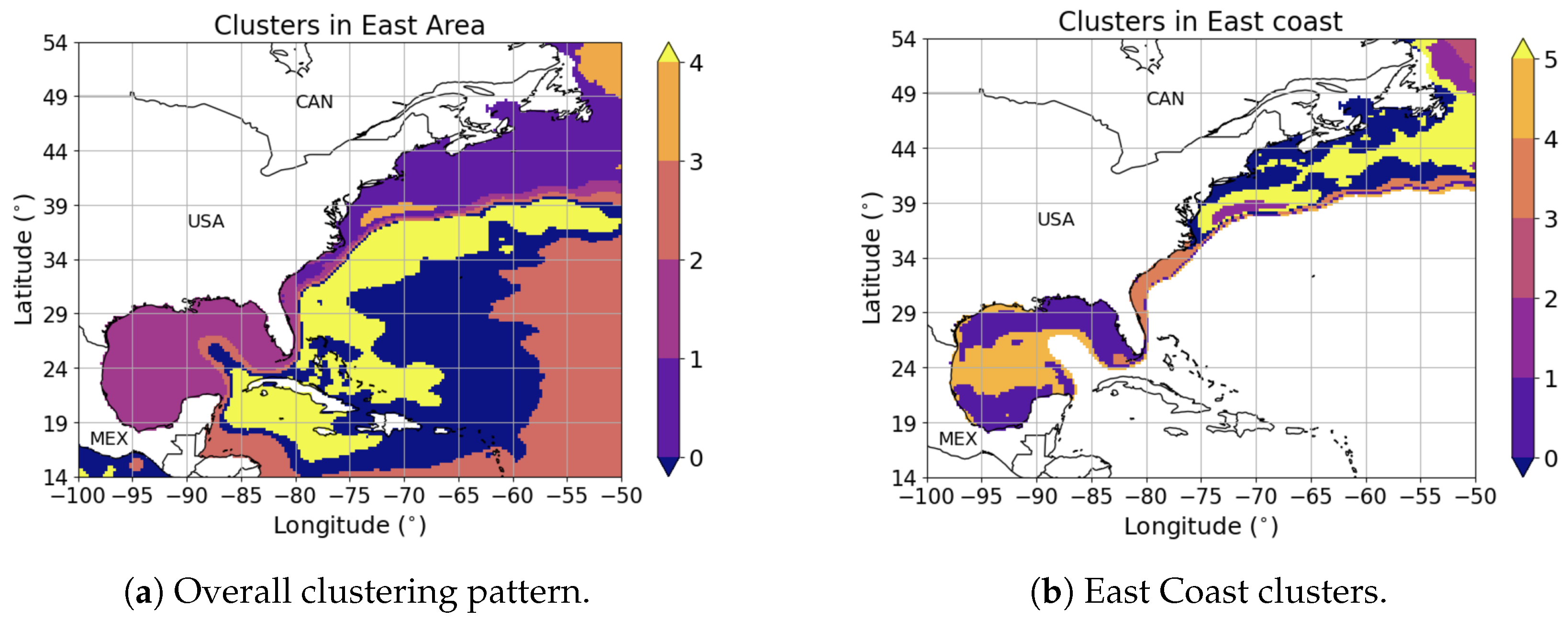 Time-series clustering of ADT along the East Coast. (a) Overall spatial patterns; (b) cluster segmentation for East Coast subregions.