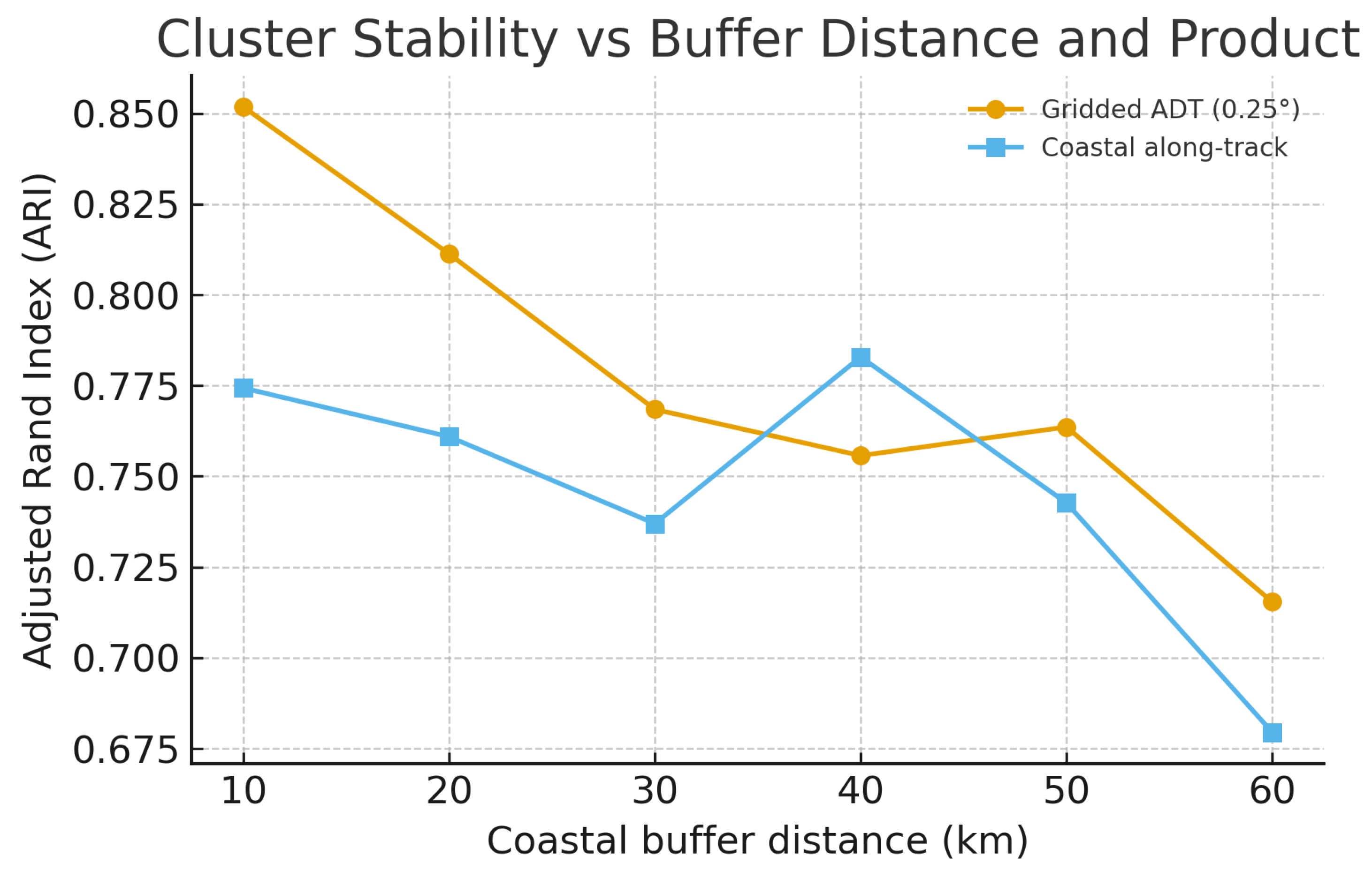 H3: (Regime stability): Clusters learned on offshore ADT remain stable (Adjusted Rand Index ≥ 0.6) when replaced with coastal altimetry within 30 km.