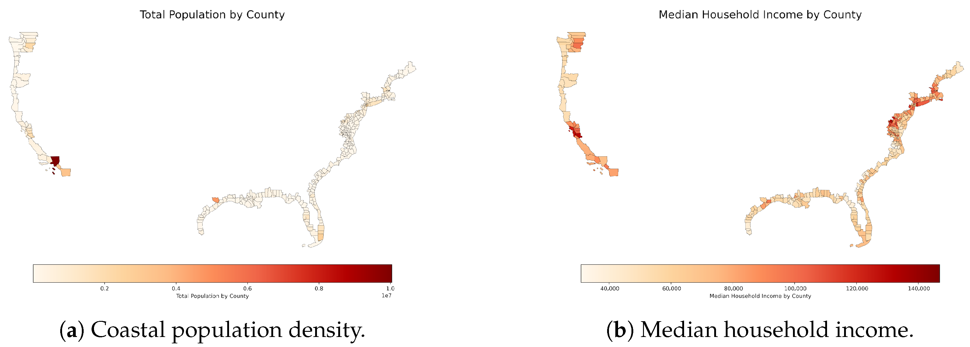 14] to contextualize regional dependence on coastal and marine economies. These exposure layers are analyzed at their native administrative resolution (county/state) and interpreted as broad indicators rather than fine-scale vulnerability at the neighborhood or parcel level.