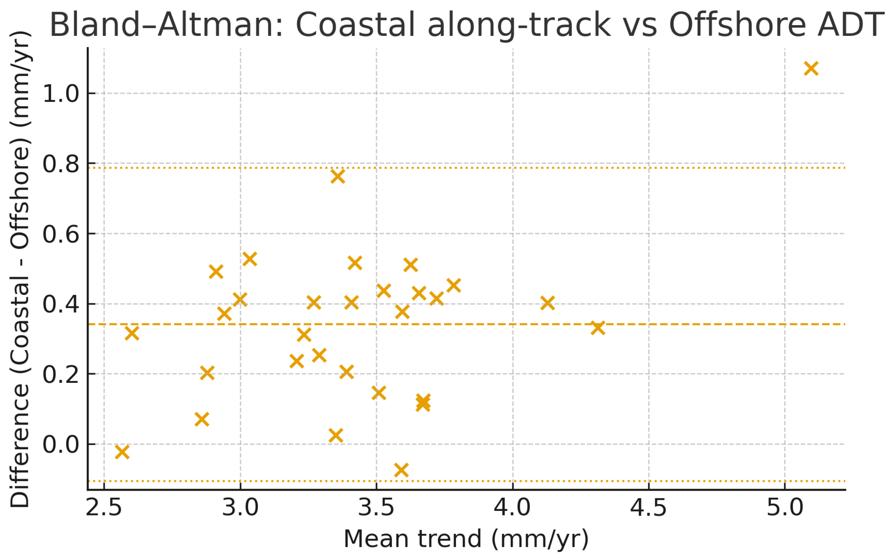 Bland–Altman plot of coastal along–track minus offshore ADT trends (mm yr−1) versus their mean. Dashed line indicates mean bias; dotted lines represent limits of agreement.
