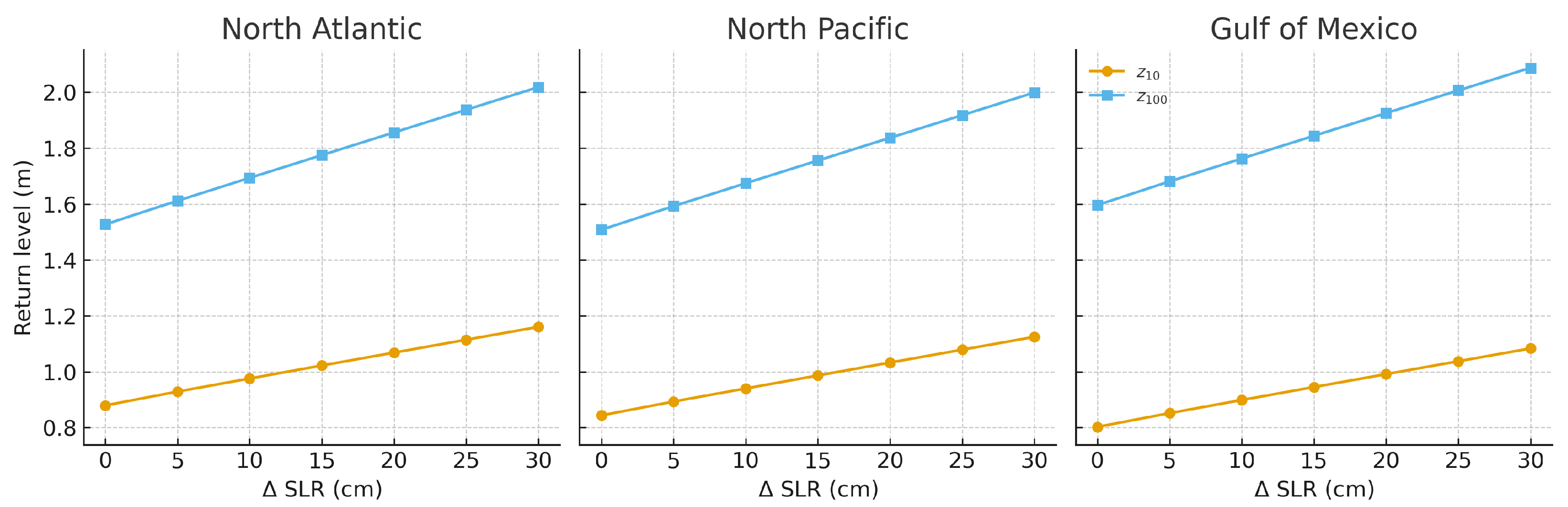 Sensitivity of 10-year and 100-year return levels (, ) to imposed mean sea-level offsets (0–30 cm) across basins.