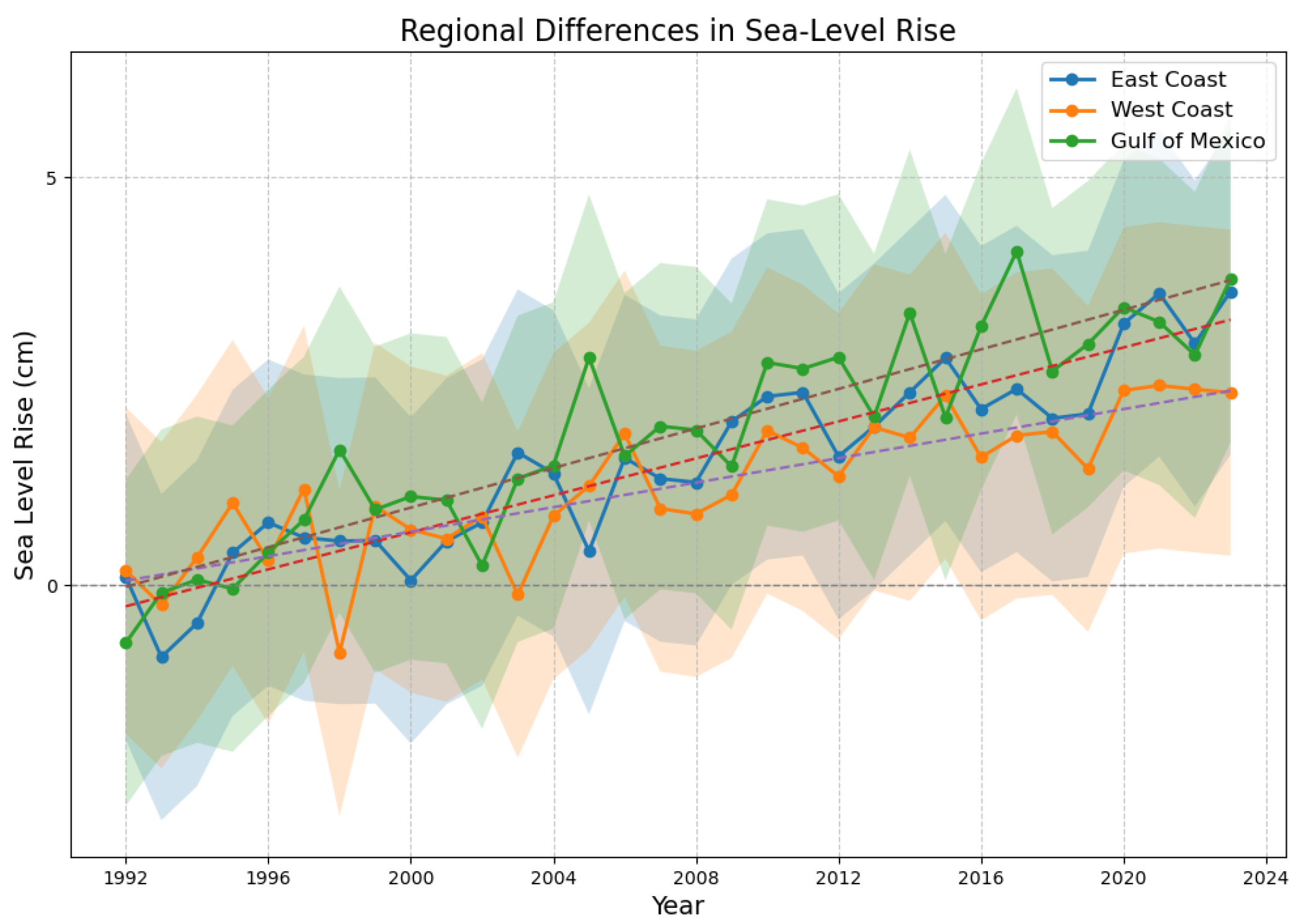 1]. However, sea-level rise exhibits strong spatial heterogeneity. Its effects are amplified or dampened by regional processes such as ocean circulation, land subsidence, and local climate variability. The U.S. coastline, in particular, experiences sea-level rise rates exceeding global averages [