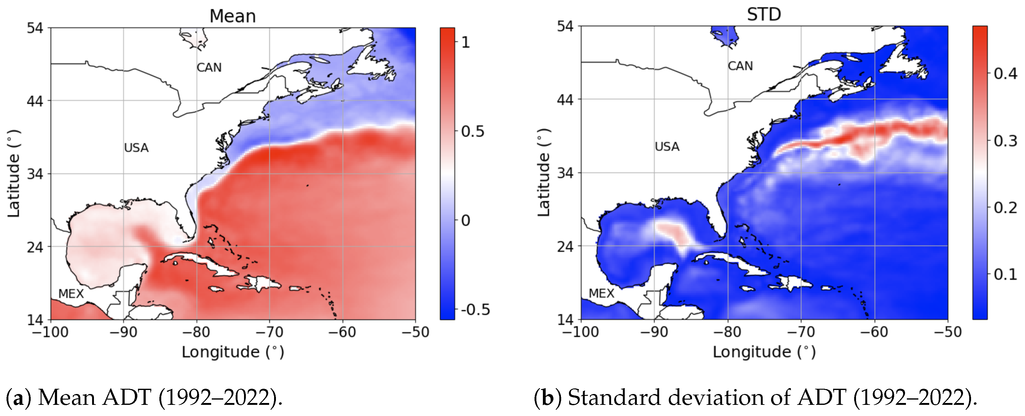Absolute Dynamic Topography (ADT) is a critical measure for assessing sea-surface height variations and provides valuable insights into ocean circulation patterns. The ADT dataset comprises satellite measurements from 1993 to 2023. These measurements have an acceptable spatial resolution of 0.25 degrees for latitude and longitude, enabling detailed spatial analysis.